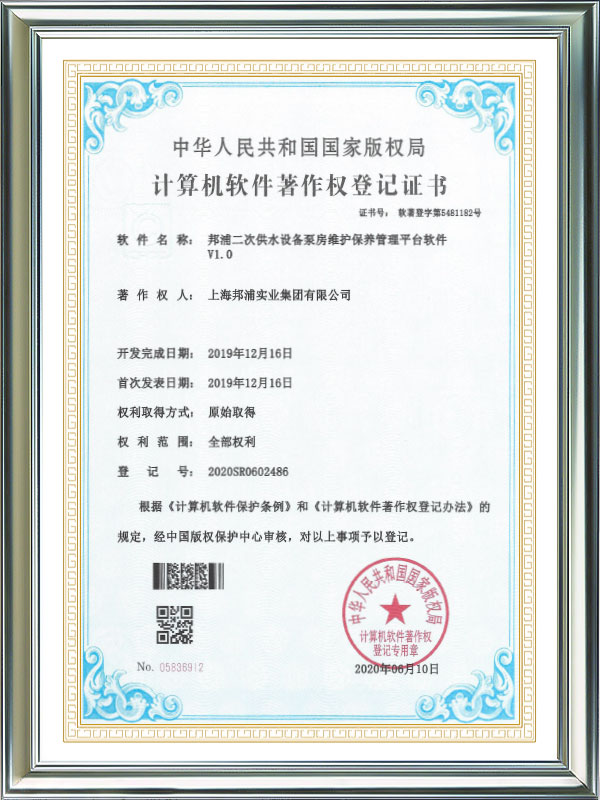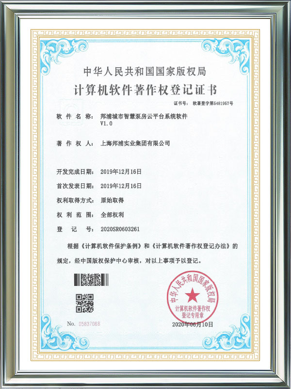 컴퓨터 소프트웨어 작업 등록 인증서 Bangpu City Smart Pump Room 클라우드 플랫폼 시스템 소프트웨어 V1.0